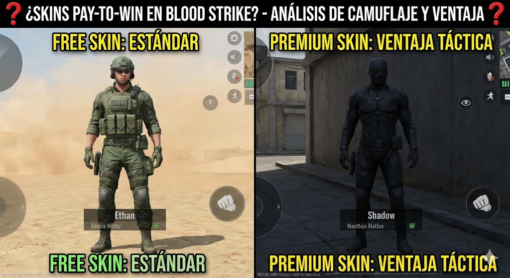 • Skins tácticas (Pay-to-Win): Tonos tierra, siluetas más delgadas (visualmente) y texturas mate.